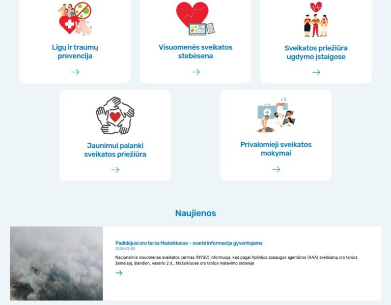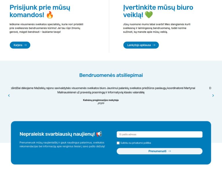 Wir haben für das Mažeikiai Public Health Office eine moderne Website erstellt, damit Gesundheitsinformationen, Neuigkeiten und Angebote für die Gemeinschaft leichter zugänglich sind. Die Plattform unterstützt den öffentlichen Gesundheitsauftrag der Einrichtung, indem sie den Einwohnerinnen und Einwohnern hilft, verlässliche Informationen zu finden und über lokale Initiativen auf dem Laufenden zu bleiben.