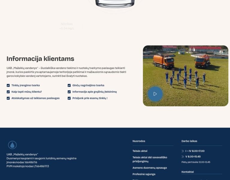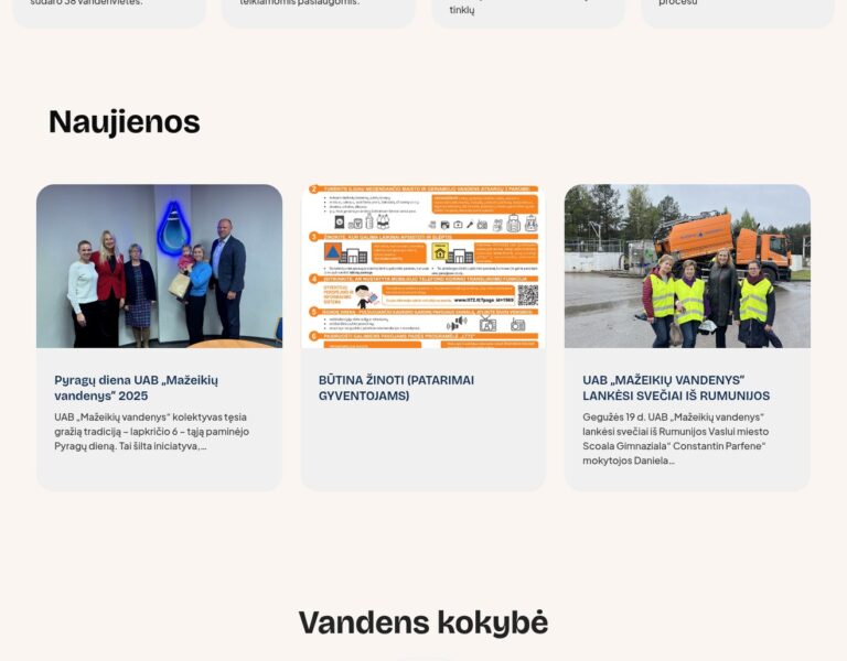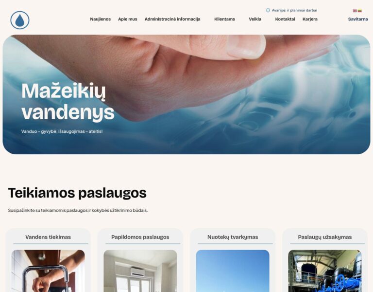 Wir haben für Mažeikiai Water Company eine moderne Website gestaltet und entwickelt, damit wichtige Informationen zu Wasserversorgung und Abwasserentsorgung leichter zugänglich sind. Die Plattform hilft Bürgerinnen und Bürgern sowie Unternehmen, Dienstleistungen, aktuelle Hinweise und praktische Informationen über ein klares, verlässliches digitales Angebot zu finden.