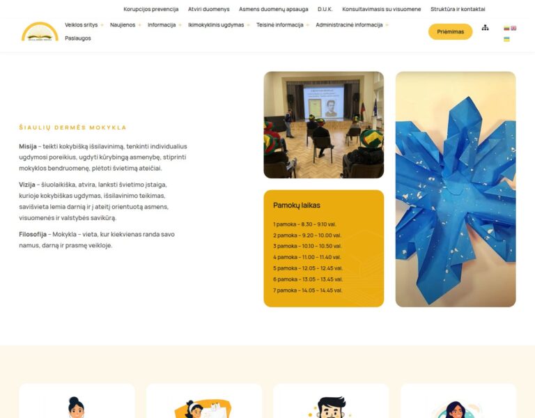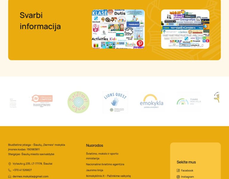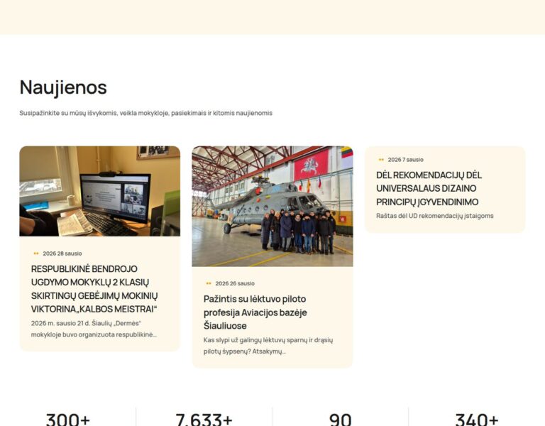Wir haben eine moderne Website für die Šiauliai Dermės School gestaltet und entwickelt, damit das Schulleben online klar und barrierearm dargestellt wird. Die Plattform hilft Schülerinnen und Schülern, Eltern und Mitarbeitenden dabei, wichtige Informationen zu finden, Schulnachrichten zu verfolgen und mit der Schulgemeinschaft in Verbindung zu bleiben.