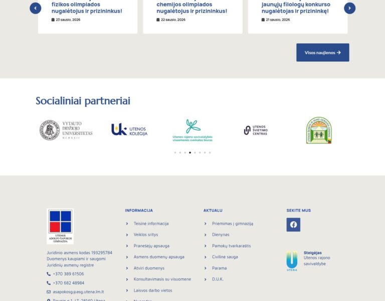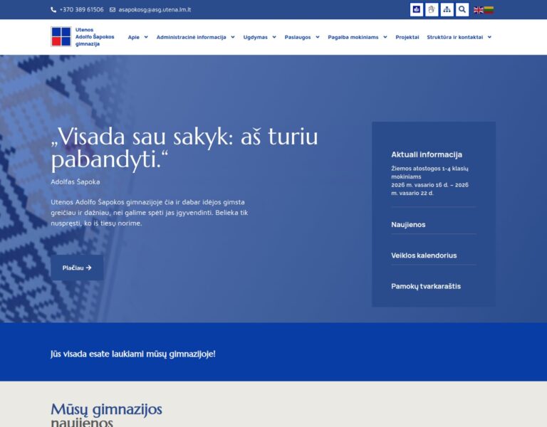 Wir haben für das Utena Adolfo Šapokas Gymnasium eine moderne Website konzipiert und umgesetzt, damit sich die Schule für Schülerinnen und Schüler, Eltern und die breite Öffentlichkeit klar präsentiert. Die neue Plattform erleichtert den Zugang zu wichtigen Informationen und unterstützt die tägliche Kommunikation in einer übersichtlicheren, nutzerfreundlichen Form.